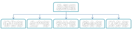本公司最高領導總經理,下設銷售部、生產部、設計部、綜合部、財務部等5大重要部門。 總經理:負責順達整體發展方向和工作方針的制定. 銷售部:分為銷售經理和銷售人員,負責順達業務的渠道開發和客戶維護。 生產部:負責所有項目產品的生產。 設計部:負責新的產品的設計開發。 綜合部:負責公司內部事務,員工招聘、公司活動等。 財務部:財務部:負責順達日常財務的管理。